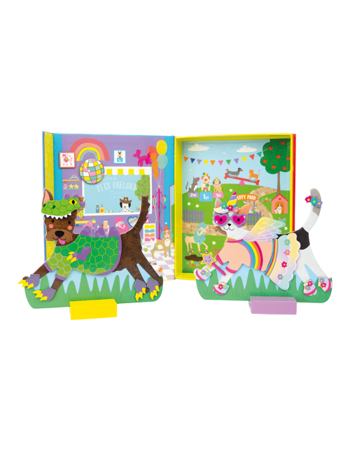 - 2 magnetiniai augintiniai - šuniukas ir katytė - su mediniais stoveliais, ant kurių jie gali būti pastatyti.