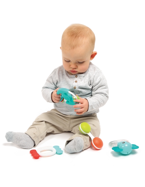 4 barškučių rinkinys - puikiai tinka lavinti ankstyvuosius smulkiosios motorikos įgūdžius.