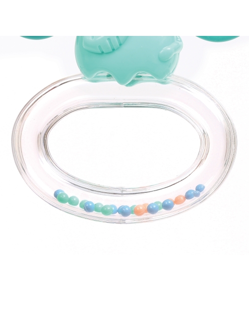Ryškios spalvos ir barškantys karoliukai atkreipia ir padeda išlaikyti mažylio dėmesį.