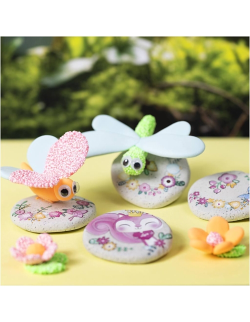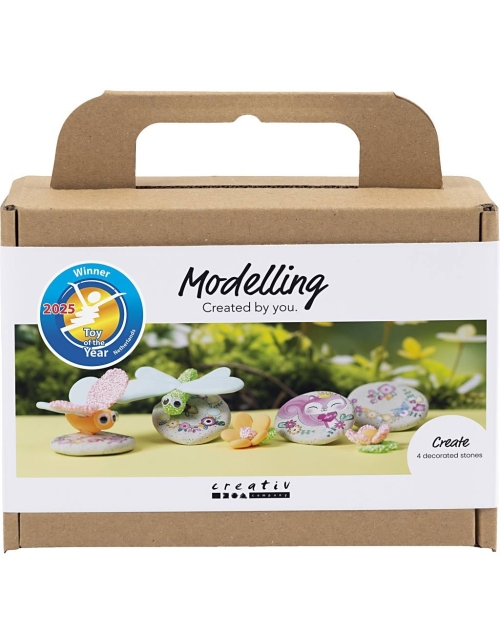 Šis rinkinys leidžia vaikams patiems susikurti unikalius akmenukus, kuriuos jie gali papuošti lipdukais bei iš modelino pagamintais padarėliais ir kitais kūriniais.