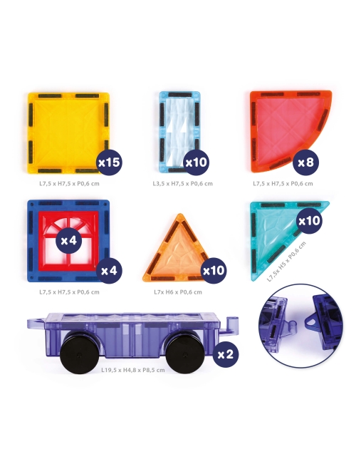- 61 magnetas (15 kvadratai, 8 apskritimo ketvirčiai, 10 stačiakampių, 20 trikampių, 4 langai).