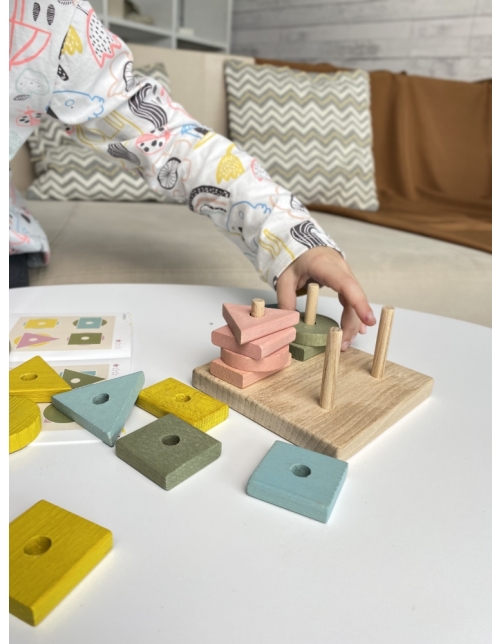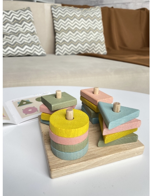 Šiame rinkinyje rasite lentą su 4 stiebeliais ir 4 rūšių geometrines formas su skylėmis viduryje. Kvadratai, stačiakampiai, trikampiai ir apskritimai yra nudažyti skirtingomis šviesiomis pastelinėmis spalvomis.